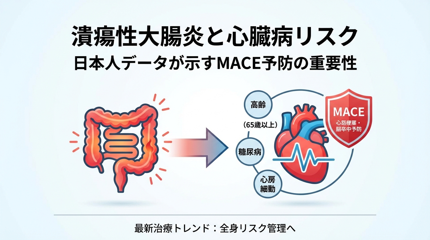 日本の大規模データにより、潰瘍性大腸炎患者様にとって、高齢(65歳以上)、糖尿病、心房細動が主要心血管イベント(MACE)の重要なリスク因子であることが特定されました。このニュースの重要な要点を改めて確認しましょう。